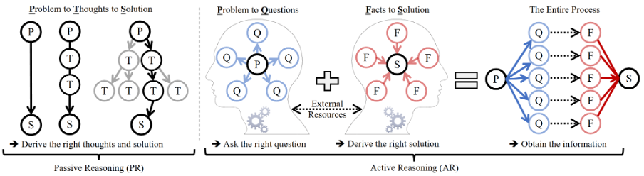 ▲ 图2. PR 要求模型通过一步步推理从给定的问题得到正确答案,而 AR 要求模型分析当前任务,提出一系列关键的问题来获取重要信息,并利用这些信息得到正确的答案。本质上,PR 的核心要求是根据问题得到正确答案,而 AR 的核心要求是提出正确的问题来获取关键的信息。