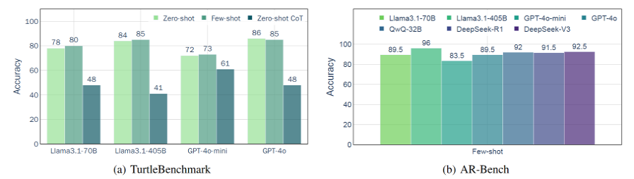 实验结果(图 4,5)表明:目前的语言模型和推理方法都无法有效解决 AR-Bench 提出的问题,我们发现: