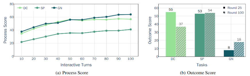过程评估:基于预设关键问题(Key Questions),通过 LLM-as-a-judge 方法以交互轮次为粒度评估对话是否有效解决关键问题(适用于 DC 和 SP ),而在 GN 任务中则直接计算反馈信息的数字准确率作为过程评分指标。
