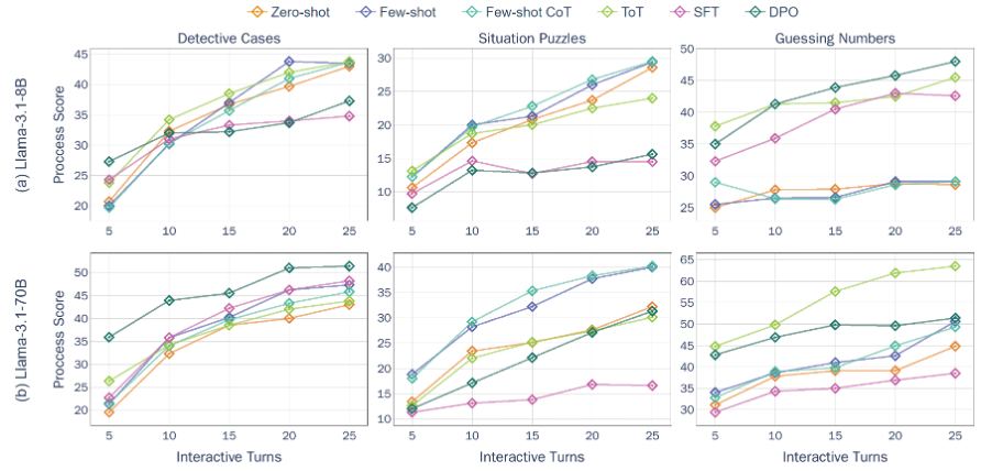 ▲ 图7. Llama-3.1-8B 和 Llama-3.1-70B 使用不同方法在 AR-Bench 推理中过程分的变化趋势。