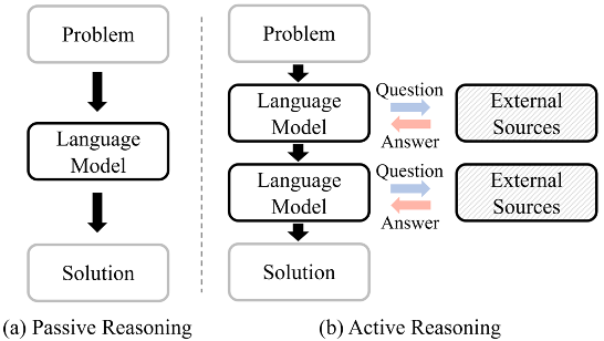 传统的 LLM 推理研究,如 CoT,大多遵循被动推理的范式。在这种范式下,模型接收一个包含所有必要信息的问题,然后逐步地推导出最终答案。然而,现实中许多场景都存在着信息不完整的情况。