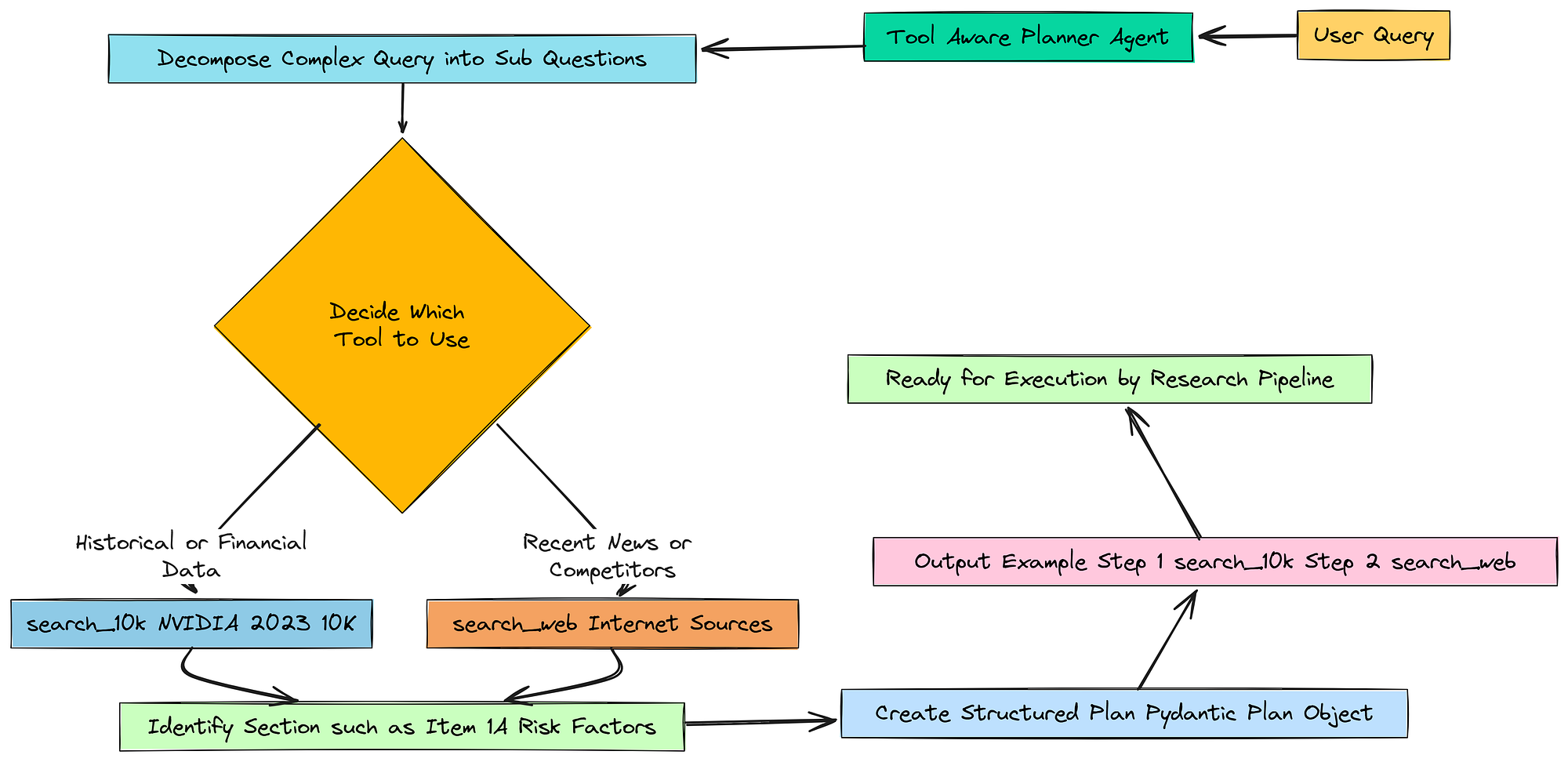 RAGState): 我们定义了一个结构化的内存,允许代理跟踪其原始问题、计划、已完成的步骤和累积的发现。这是实现迭代推理的基础。 - 工具感知规划器: 代理首先将复杂查询分解为一系列子问题,并为每个子问题智能地选择正确的工具(内部 10-K 搜索或外部网络搜索)。