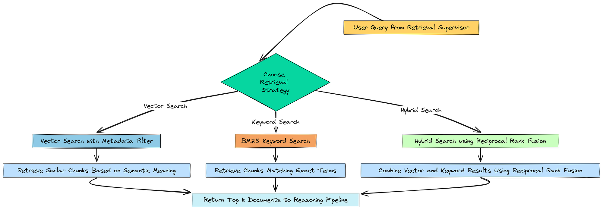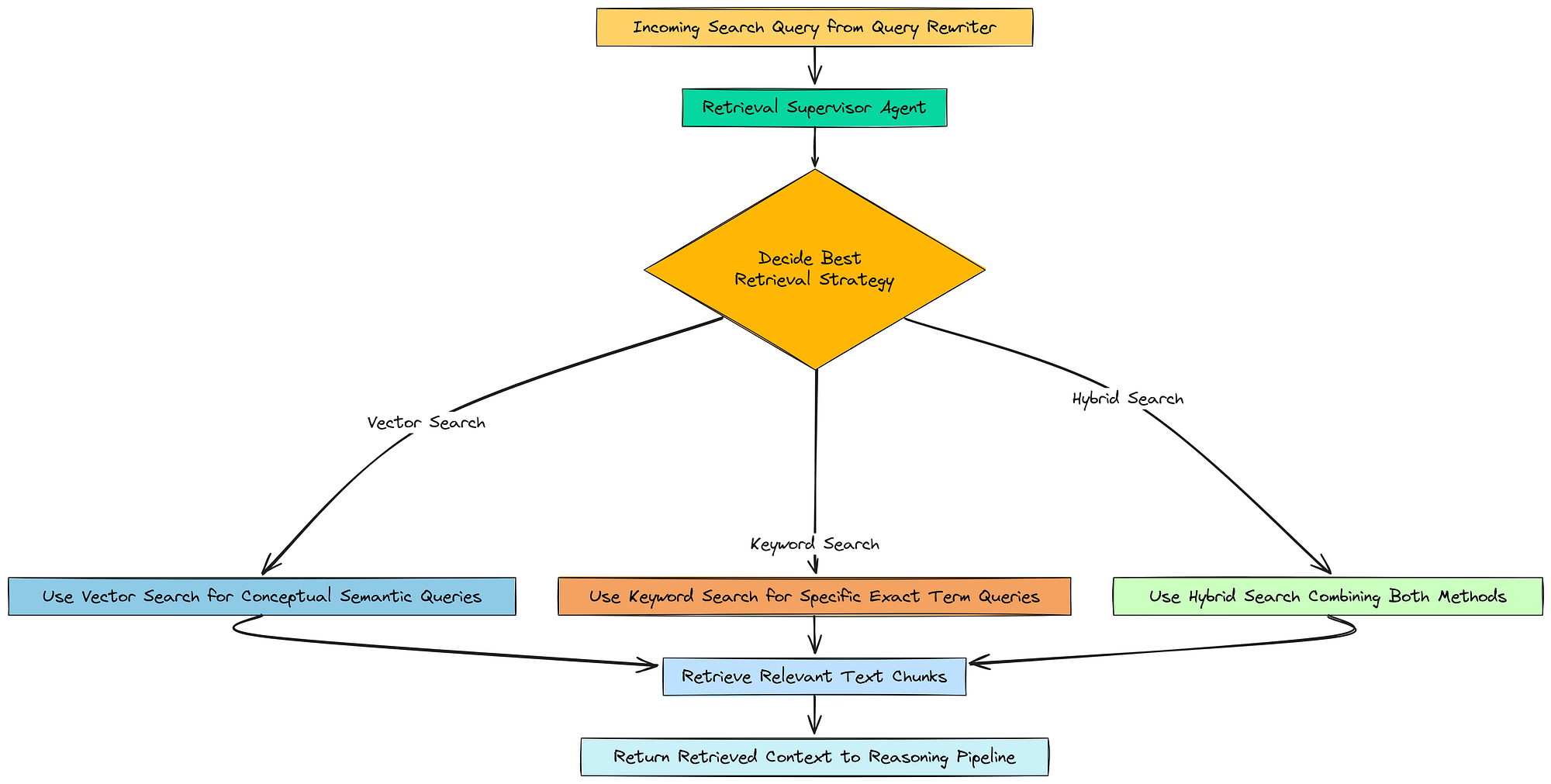 - 监督器: 动态选择最佳检索策略(向量、关键词或混合)。