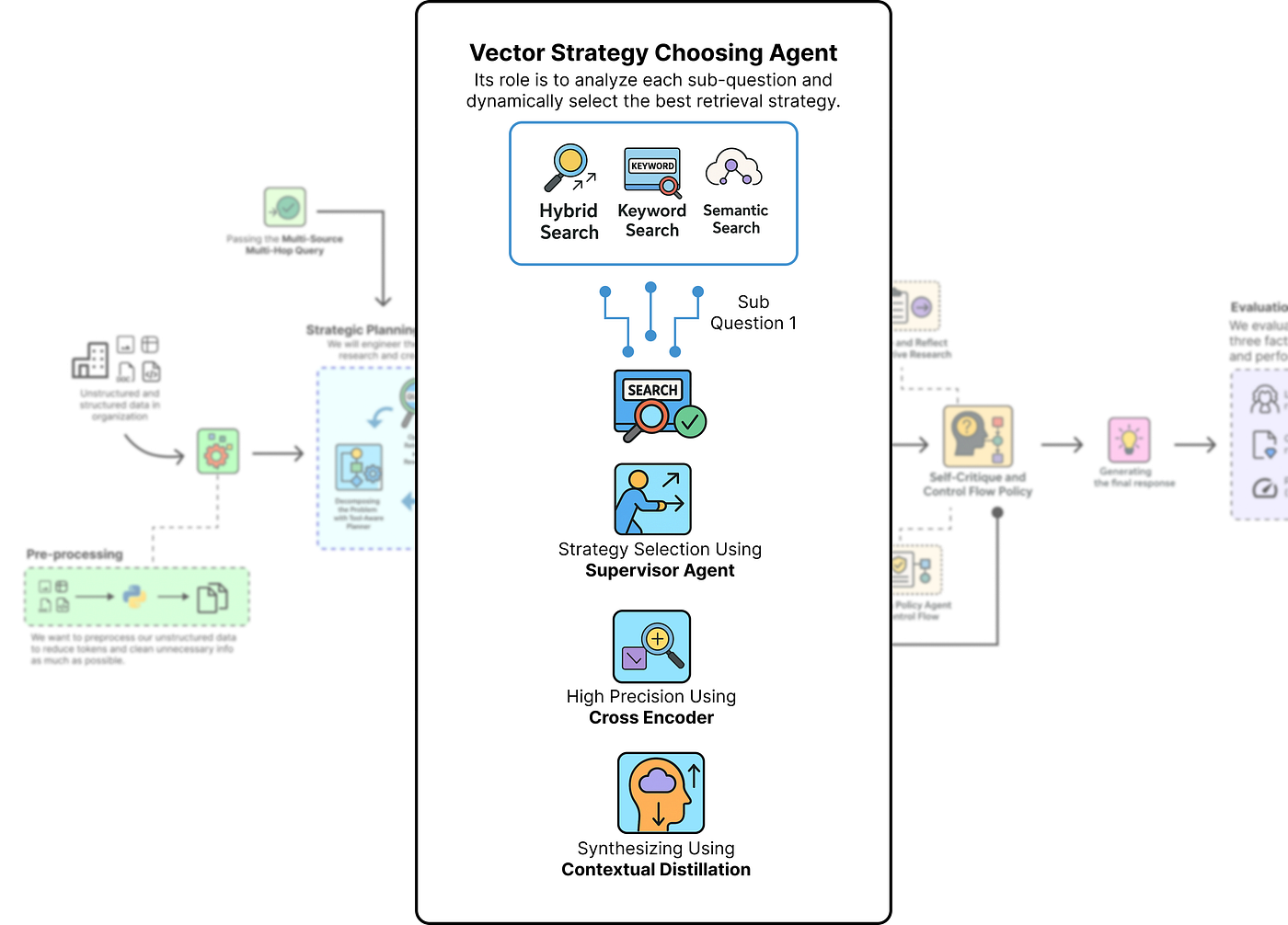 - 检索: 对于每个步骤,它执行一个自适应的多阶段检索漏斗,使用一个监督器动态选择最佳搜索策略(向量、关键词或混合)。