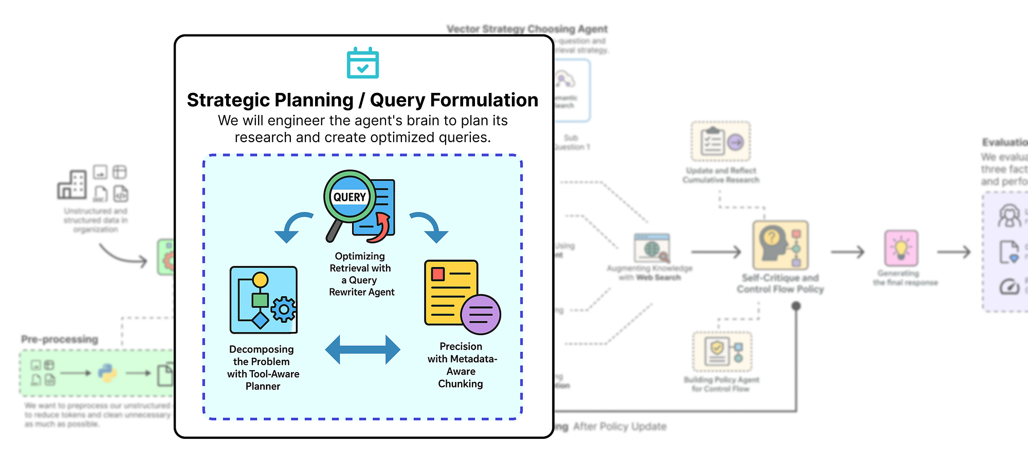 - 规划: 首先,代理将复杂的用户查询分解为结构化的多步骤研究计划,决定每个步骤需要使用哪种工具(内部文档搜索或网络搜索)。