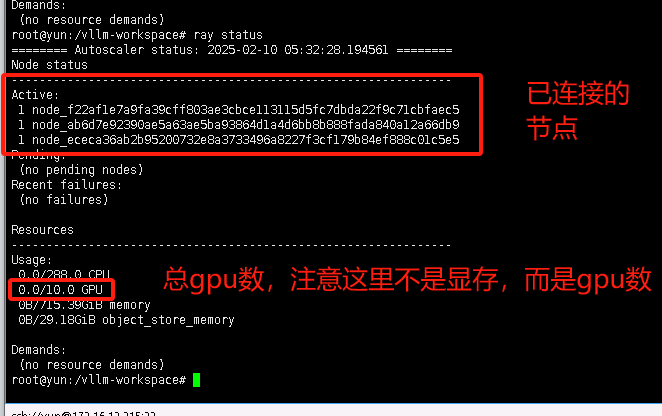 所有都成功启动后可以使用任何一台机器的ssh会话,因为已经通信,所以哪台机器都可以启动vllm。注意不要关闭任何一台机器的run_cluster启动的页面,