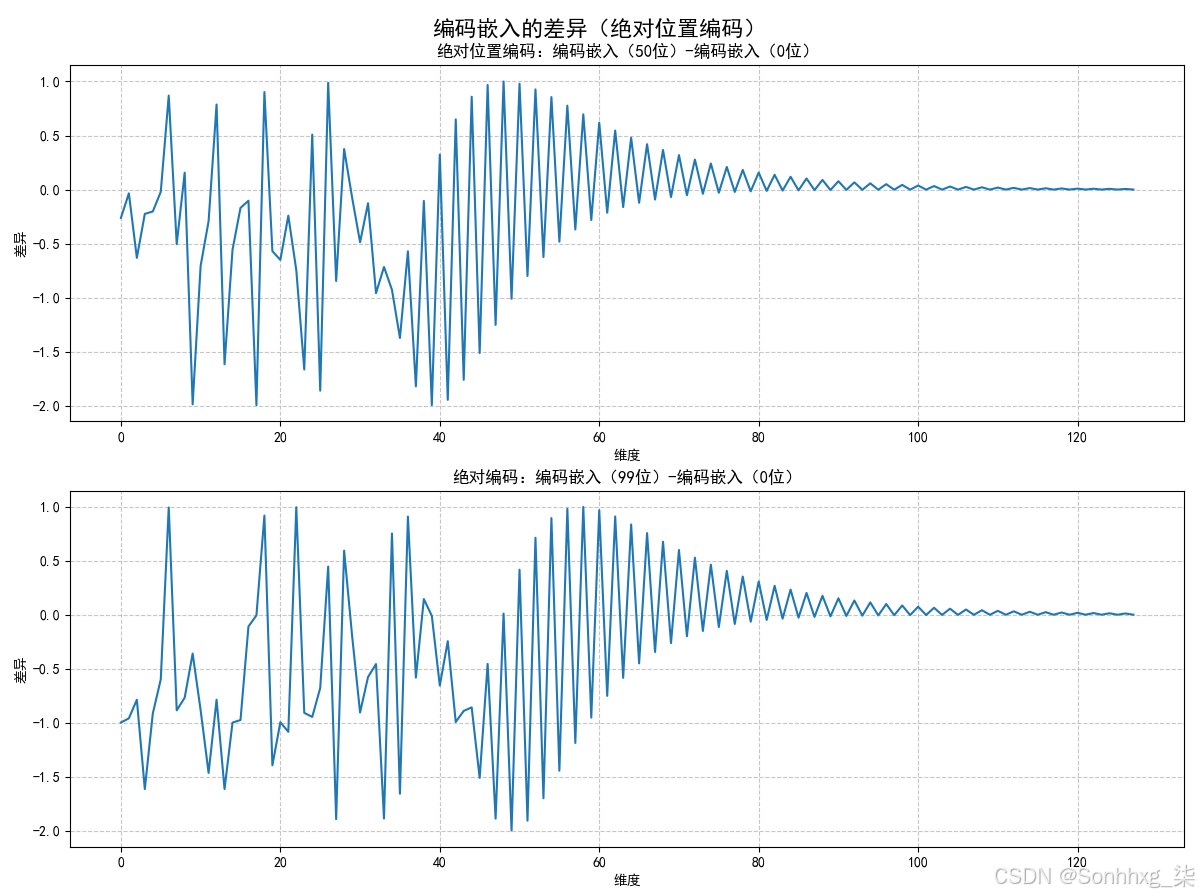位置信息的局部化:最显著的差异出现在嵌入向量的初始维度。这表明位置信息主要编码在这些早期维度中。(此处同样成立) 振幅递减现象:随着维度升高,差异振幅逐渐减弱。这说明后续维度受位置编码的影响较小。(此处同样成立) 词汇信息的保留:后续维度差异极小,表明这些维度主要保留词汇本身信息,几乎不受位置因素干扰。(此处同样成立)