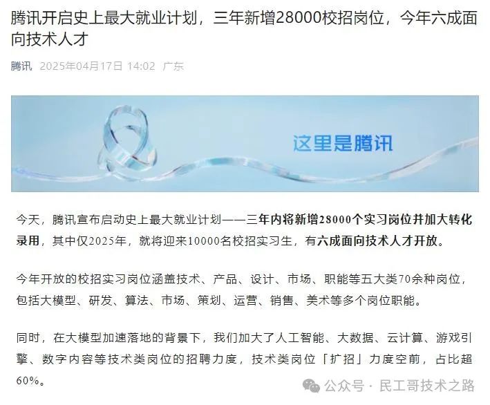 2025年4月17日,腾讯宣布启动史上最大就业计划,计划在三年内新增28000个实习岗位,并加大转化录用力度。其中,2025年将迎来10000名校招实习生,六成岗位面向技术人才开放。