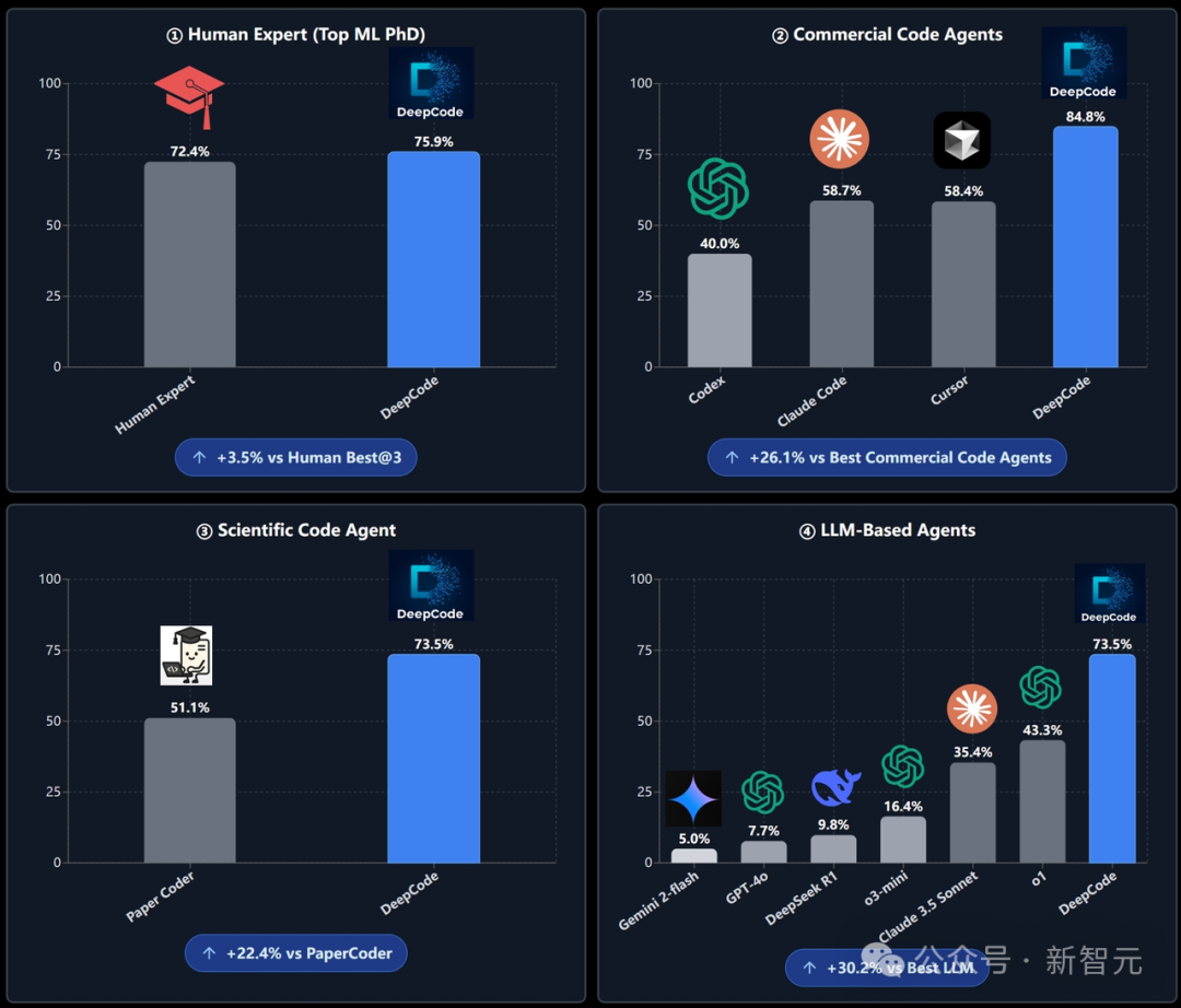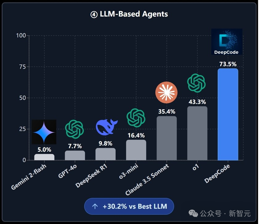 与性能最佳的大模型智能体(43.3%)相比,DeepCode(73.5%)提升了30.2个百分点。