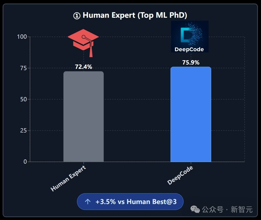 在OpenAI发布的PaperBench基准测试中,DeepCode的总体准确率为75.9%,超过参与评测的人类专家组72.4%的成绩。
