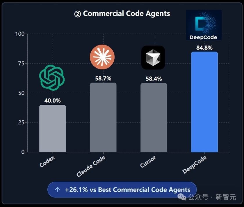 DeepCode得分84.8% ,领先Claude Code(58.7%)约26.1个百分点。