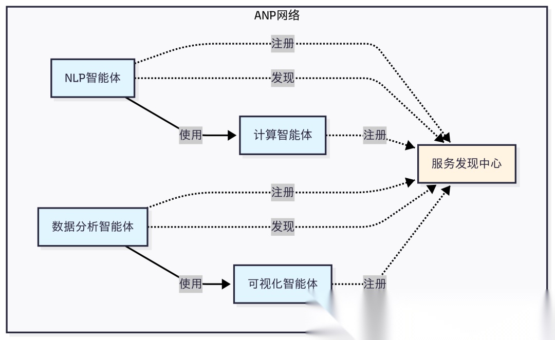ANP的设计哲学是"去中心化服务发现"。在一个包含成百上千个智能体的网络中,让智能体找到它需要的服务。ANP提供了服务注册、发现和路由机制,让智能体能够动态地发现网络中的其他服务,而不需要预先配置所有的连接关系。