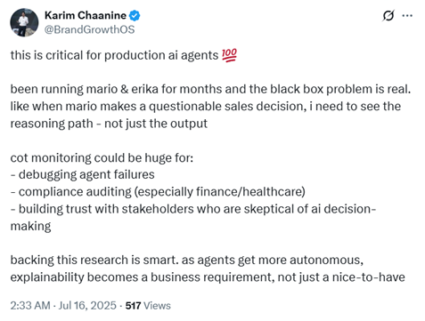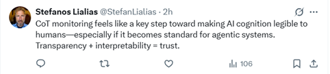 思维链监控似乎是让人类能够理解AI认知过程的关键一步,尤其是如果它能成为智能体的标准配置的话。透明度与可解释性相结合,就能产生信任。
