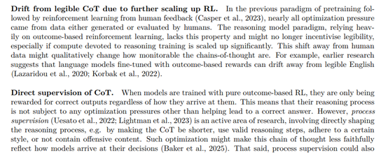 例如,直接监督CoT的训练方法可能会使模型的CoT更短、更符合逻辑,或者避免包含不当内容。虽然这些优化目标可能会提高模型的对齐性,但同时也可能会使CoT不再真实反映模型的决策过程。