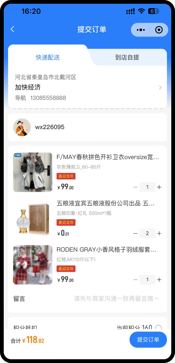 进入下单页面,可根据用户需求选择快递配送或到店自提。