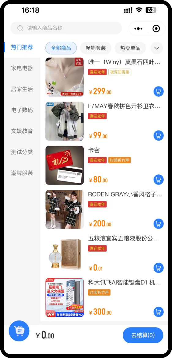 服务对象选择完成点击下单后进入商品选择页面,可按照商品分类或搜索商品名称快速找到对应商品。