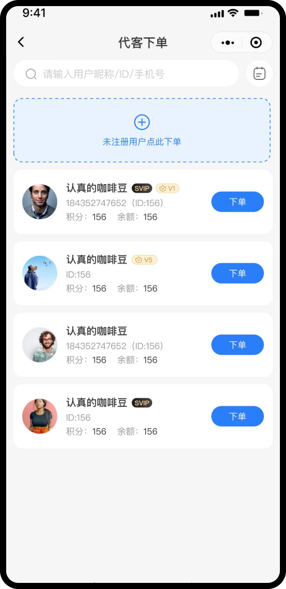 可通过用户ID,手机号搜索系统用户,点击下单按钮为其下单。