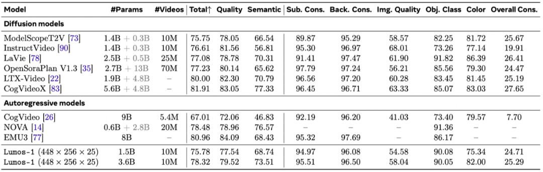 文生视频能力:在VBench-T2V基准上,其表现同样出色:即使没有依赖一个庞大且预训练好的文本编码器,性能依然能与OpenSoraPlan等依赖强大文本理解能力的先进扩散模型效果相当。由于我们的自回归生成范式保证了第一帧的质量,自回归离散扩散视频生成模型Lumos-1在物体类别和颜色等以物体为中心的指标上表现优异,视频内容的一致性更强。