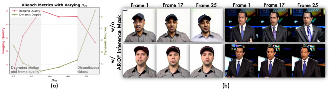 图7 (a) AR-DF推理阶段使用的掩码比例对于VBench指标的影响; (b) AR-DF推理阶段使用的掩码与否对于可视化结果的影响。