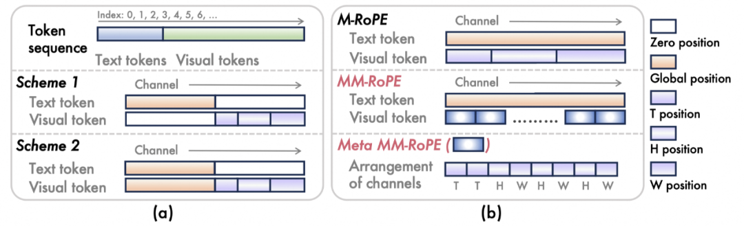 图1(a)3D RoPE诊断的基础方案。(b)MM-RoPE的具体细节