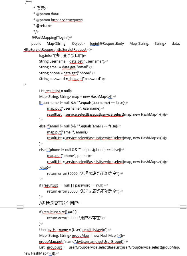 登录页,首先传入"username"、"email"、"phone"、"password",用户可通过用户名、邮箱、手机号进行登陆,通过判断resultList来确定查询结果,然后执行查询用户组UserGroup,用户组里面不存在,依然报“用户不存在”,执行完以上代码,最后涉及到用户带有“审核”的,会查询examine_state(用户的审核状态),数据库表user_group中含有source_table和source_field进行查询,以上步骤完成,对输入的密码进行存储Token到数据库,匹对账号和密码,数据库中的AccessToken为令牌,用于身份认证,代码如图所示。