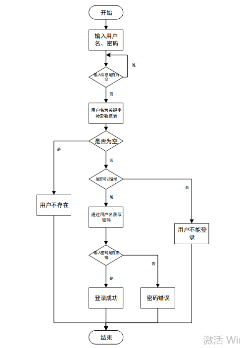 用户输入用户名和密码后,系统先检查输入是否为空,再验证用户名是否存在,若存在则通过用户名获取密码并校验。若密码正确则登录成功,否则提示密码错误。若用户名不存在或无法登录,提示用户操作无效。如图3-3所示。