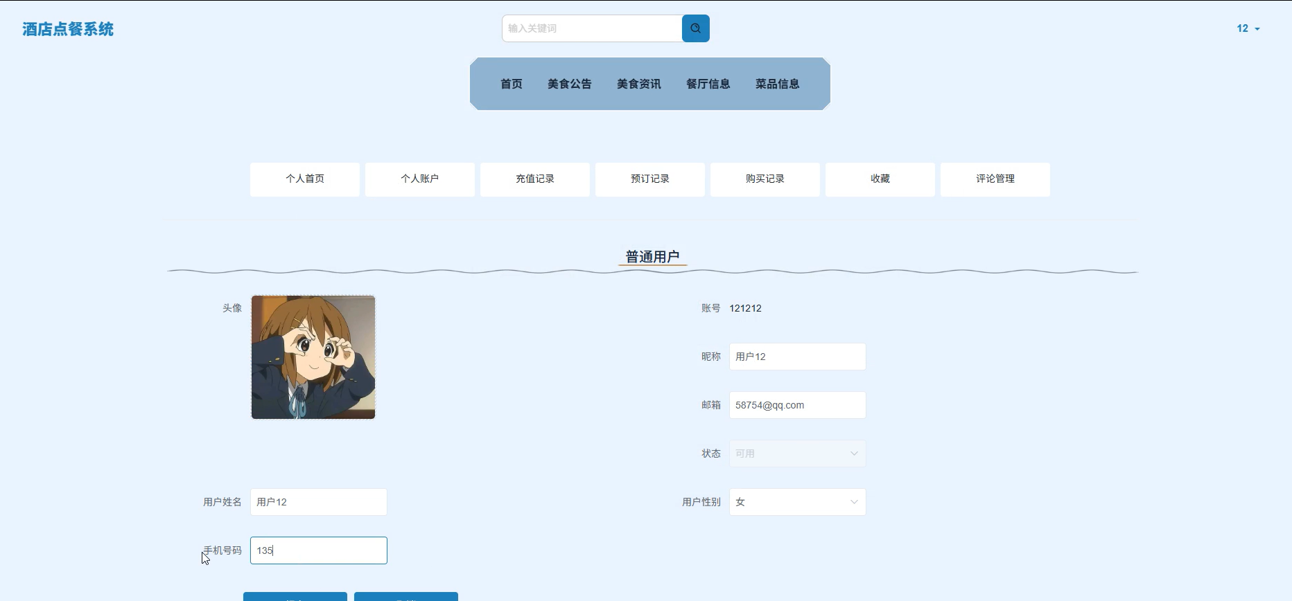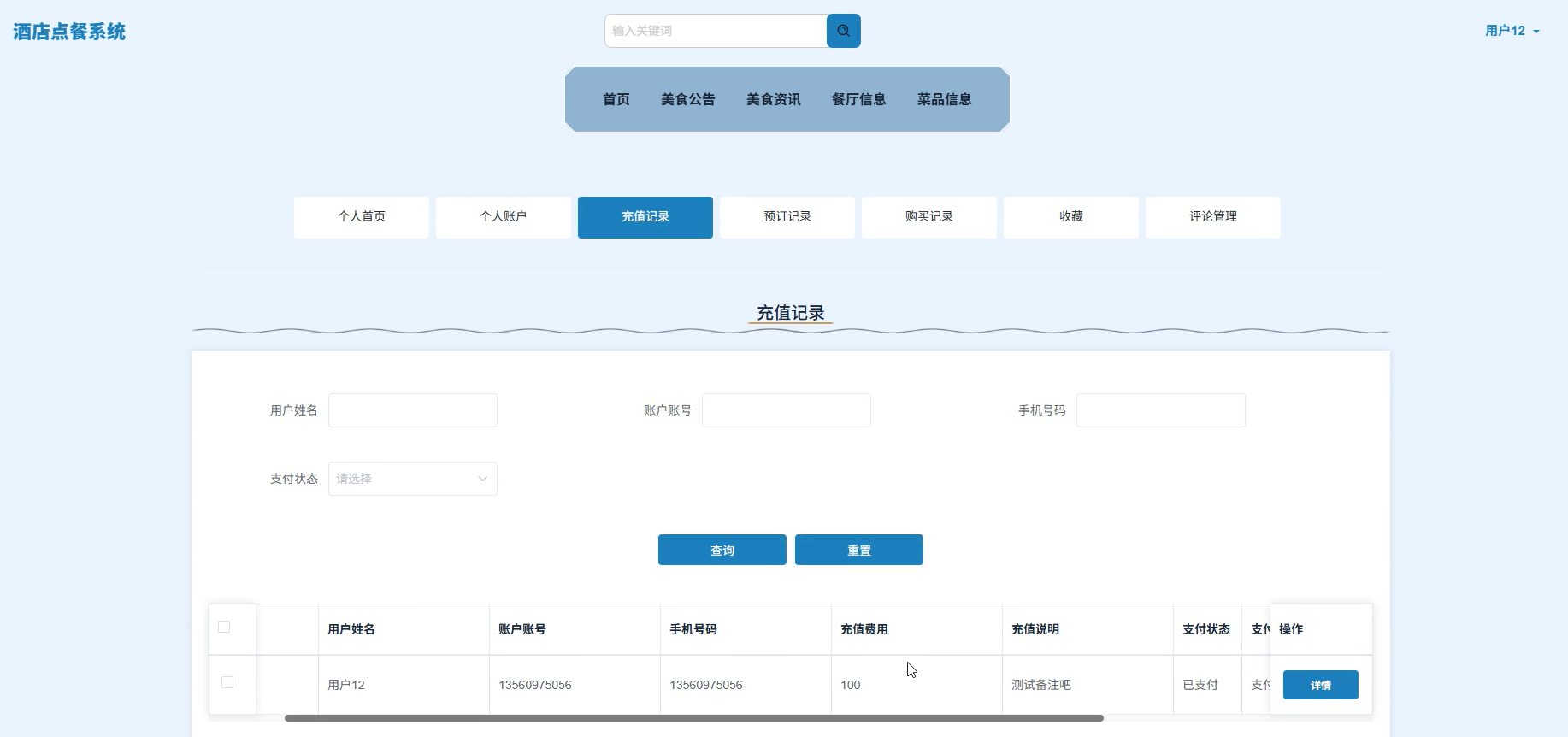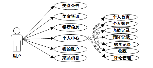 用户可以查看美食公告、美食资讯、餐厅信息、菜品信息、我的账户、个人中心(个人首页、个人账户、充值记录、预订记录、购买记录、收藏、评论管理)等信息。