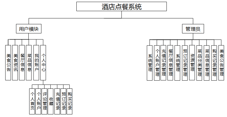 系统总体功能设计围绕普通用户与管理员两个角色展开,涵盖用户端的菜品浏览、在线预订、账户管理、信息查询与互动操作,以及管理端的用户权限控制、餐厅与菜品信息维护、订单与充值记录管理、公告与资讯内容发布等功能,实现前后端信息互通与高效协同的餐饮服务平台架构。系统功能结构图如图4-2所示。