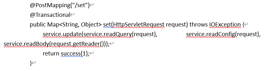 修改一个数据,原理与add基本一致,不同点在于通过readConfig()读取关键字,以及通过readQuery()获取URL后面?指定位置的标识,转成Map对象后,执行update操作,同样通过拼接的sql语句执行,执行过程读取query,toWhereSql()语句完成数据库操作,body为修改对象的值,代码如图所示。