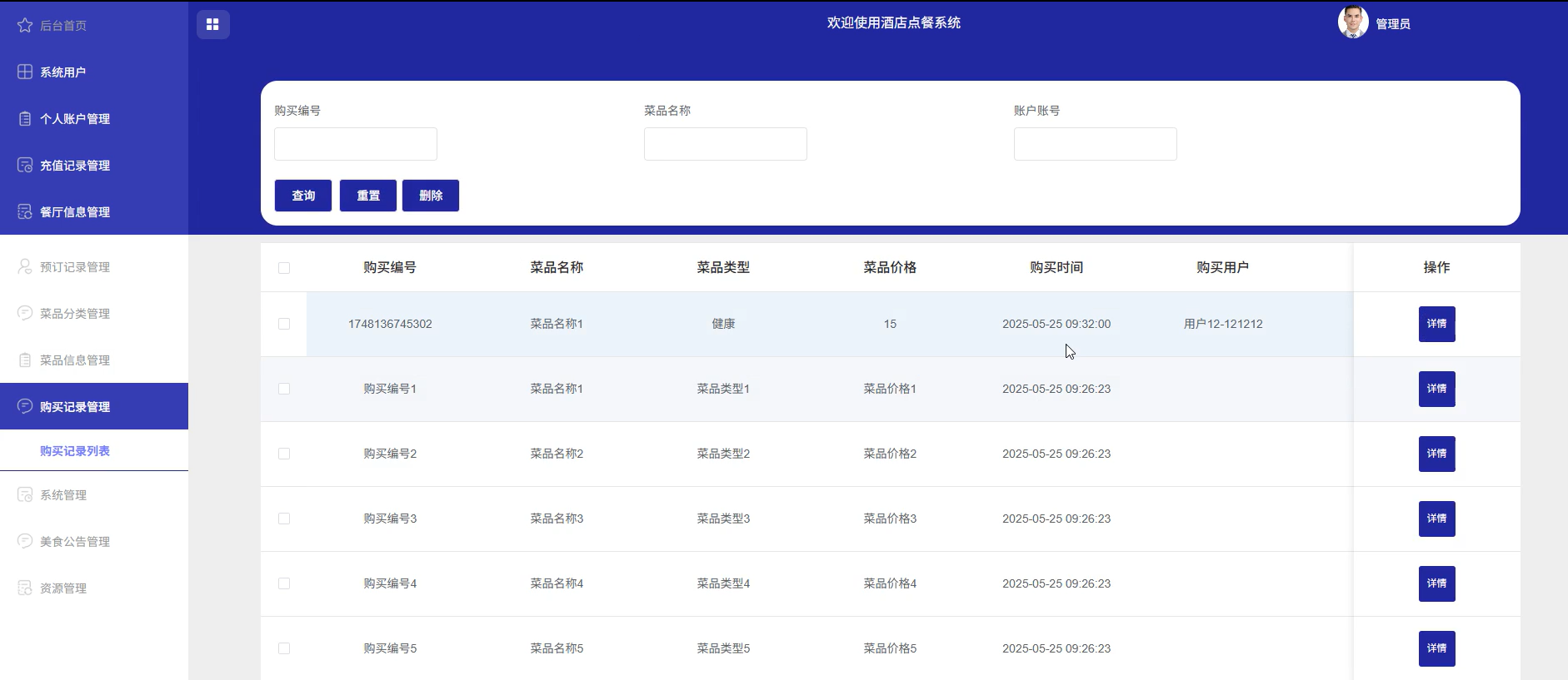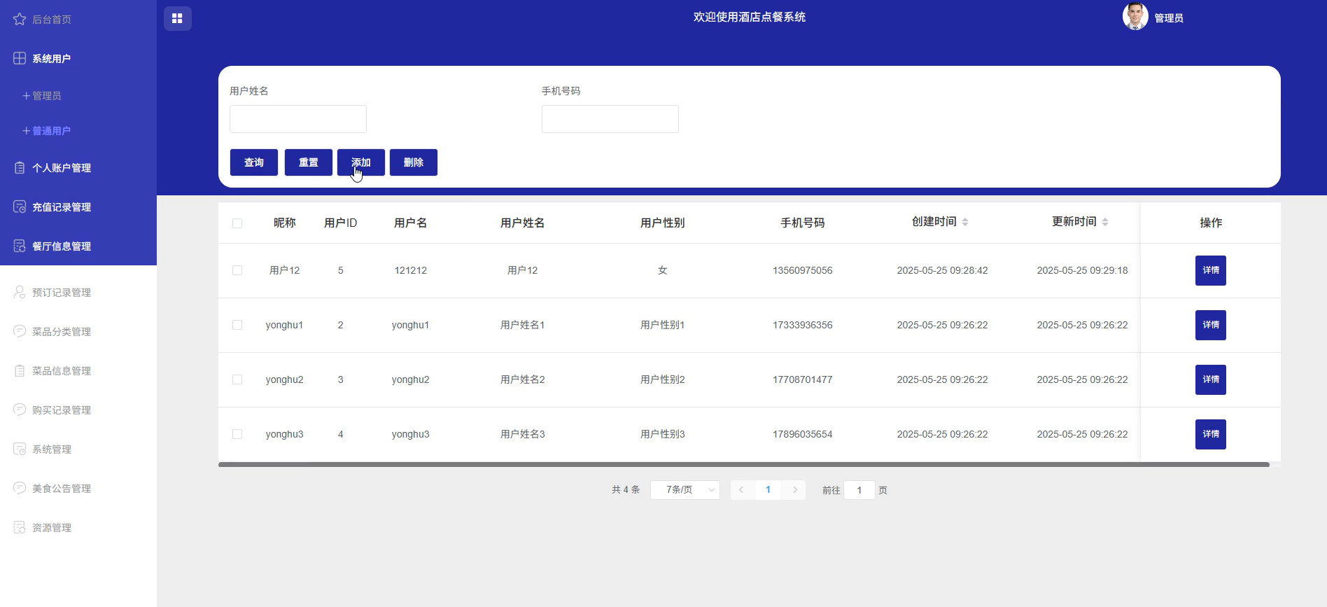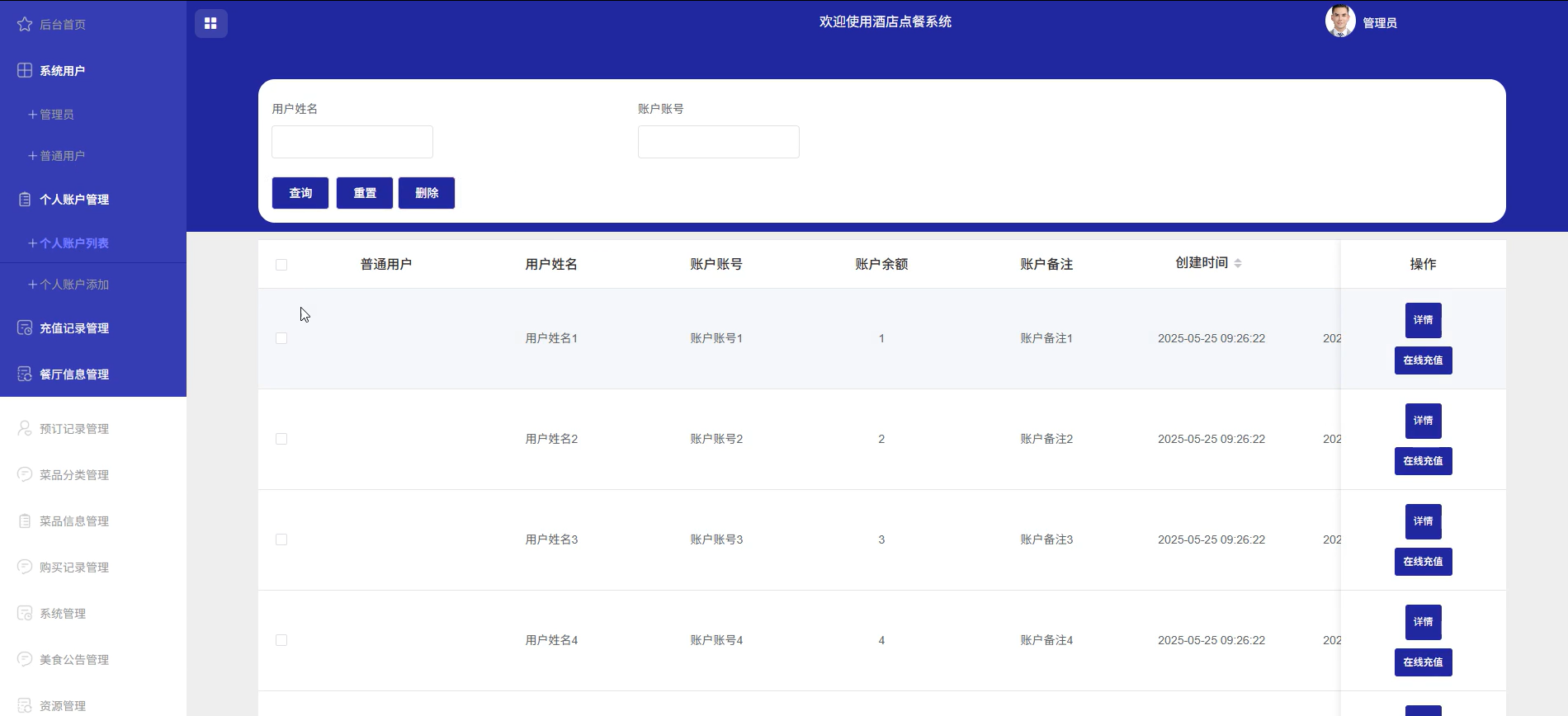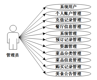 管理员可以管理系统用户(管理员、普通用户)、个人账户管理、充值记录管理、餐厅信息管理、预订记录管理、菜品分类管理、菜品信息管理、购买记录管理、系统管理(轮播图管理)、美食公告管理、资源管理(美食资讯、资讯分类)等信息。