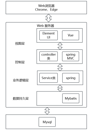 本项目采用B/S架构,遵循MVC设计思想,采用前后端分离的方式进行架构搭建。系统主要由表示层、控制层、业务逻辑层和数据层构成,整个系统架构如图4-1所示。
