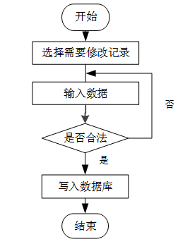 用户首先选择需要修改的记录,输入修改后的数据,系统判断输入数据是否合法。若数据不合法,提示重新输入;若数据合法,则将修改后的数据写入数据库,完成操作后流程结束。修改信息流程图如图3-5所示。
