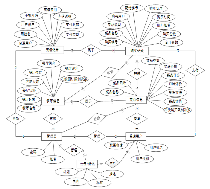 系统需满足用户在线浏览餐厅与菜品信息、发布与查看美食资讯及公告、下单预订、账户管理、充值与购买记录查询、评论与收藏操作等功能,同时支持管理员对系统用户、菜品分类与信息、订单记录、充值记录、美食资讯与公告、资源内容等模块进行统一管理,确保前后端协同运行、高效管理与便捷服务。各角色功能如下: