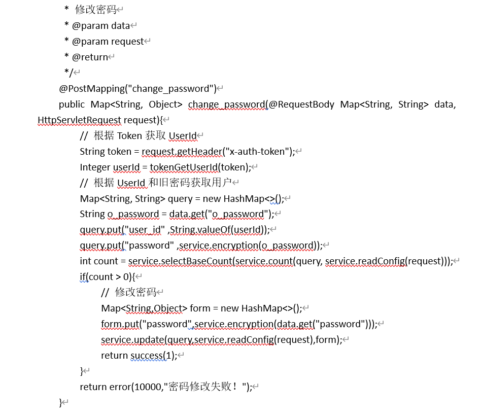 修改密码,通过请求data,获取旧密码,并将新密码重新赋值,期间都是需要通过加密,代码如图所示。