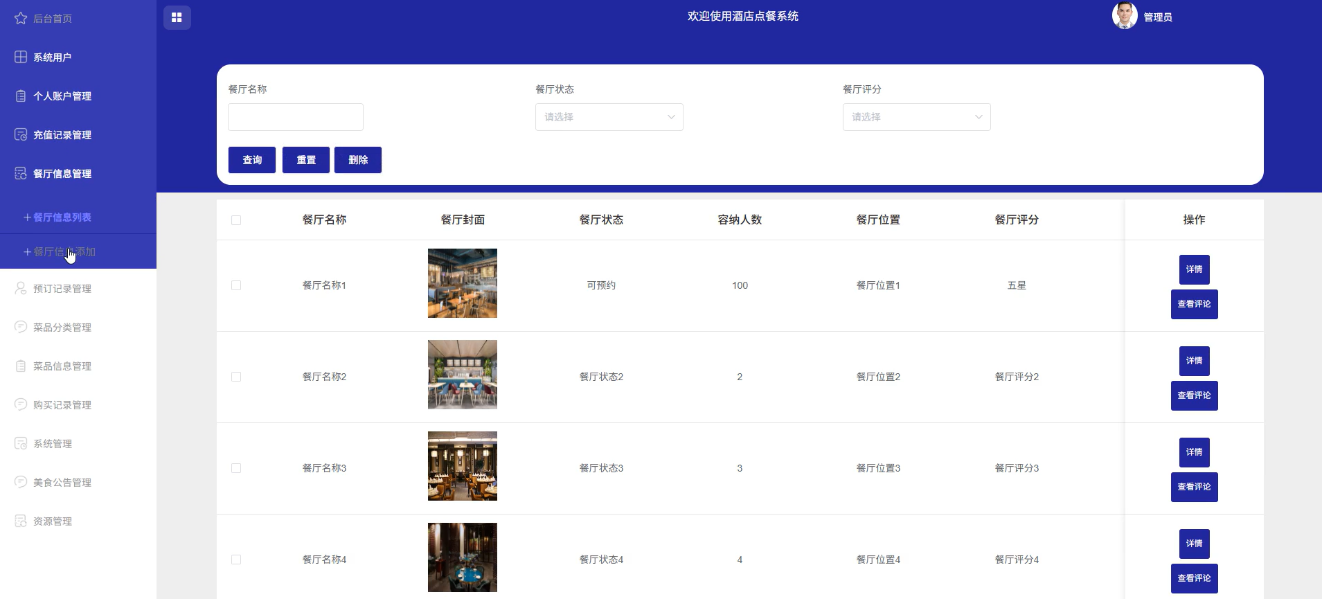 5. 餐厅信息管理:用于录入、修改或删除入驻酒店与餐厅的基本资料,便于对接前端展示与后台运营维护,保障信息的及时更新。