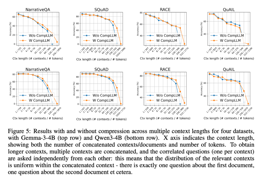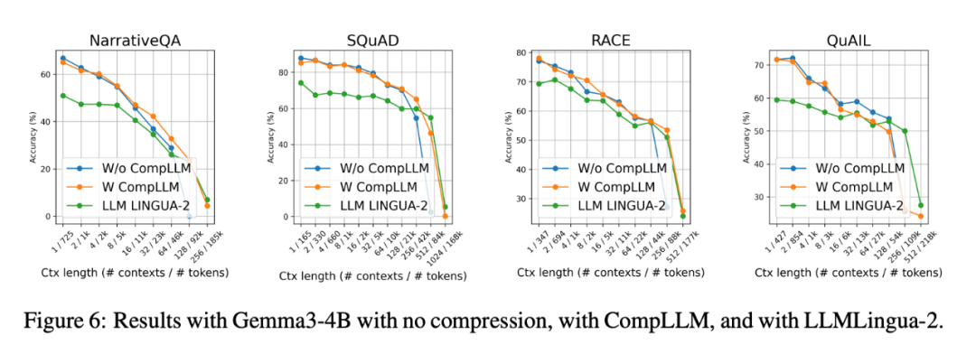 ▲ 图5. CompLLM 在四个数据集上,长上下文下准确率显著超过基线。