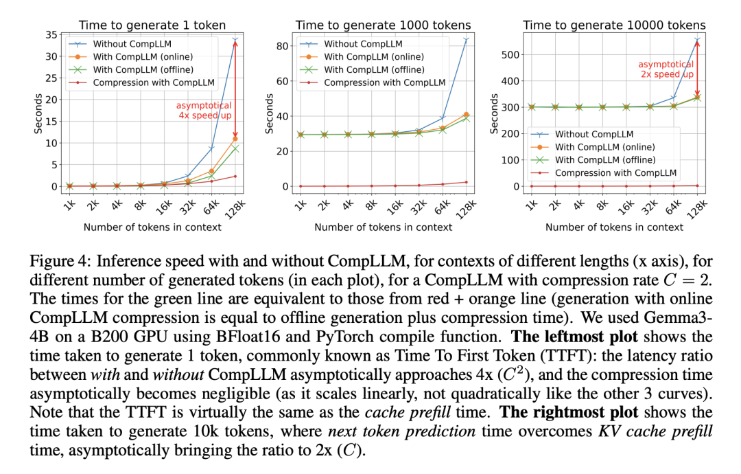 ▲ 图4. CompLLM在2×压缩下实现TTFT提速4×,KV cache减半,生成速度翻倍。