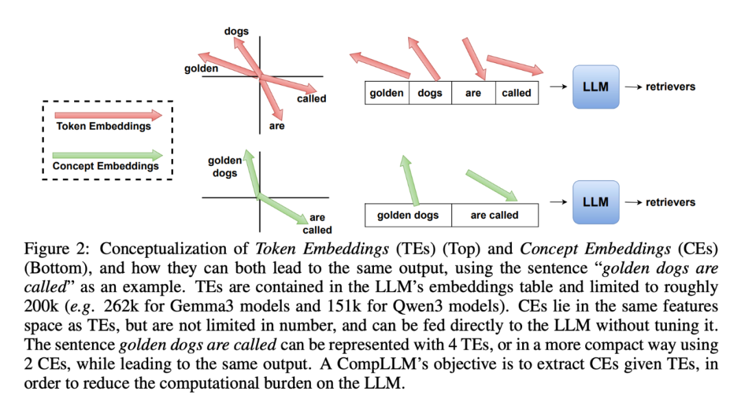 CompLLM 提出 Concept Embedding (CE),即将一段 token 的信息「压缩打包」成更少的向量。