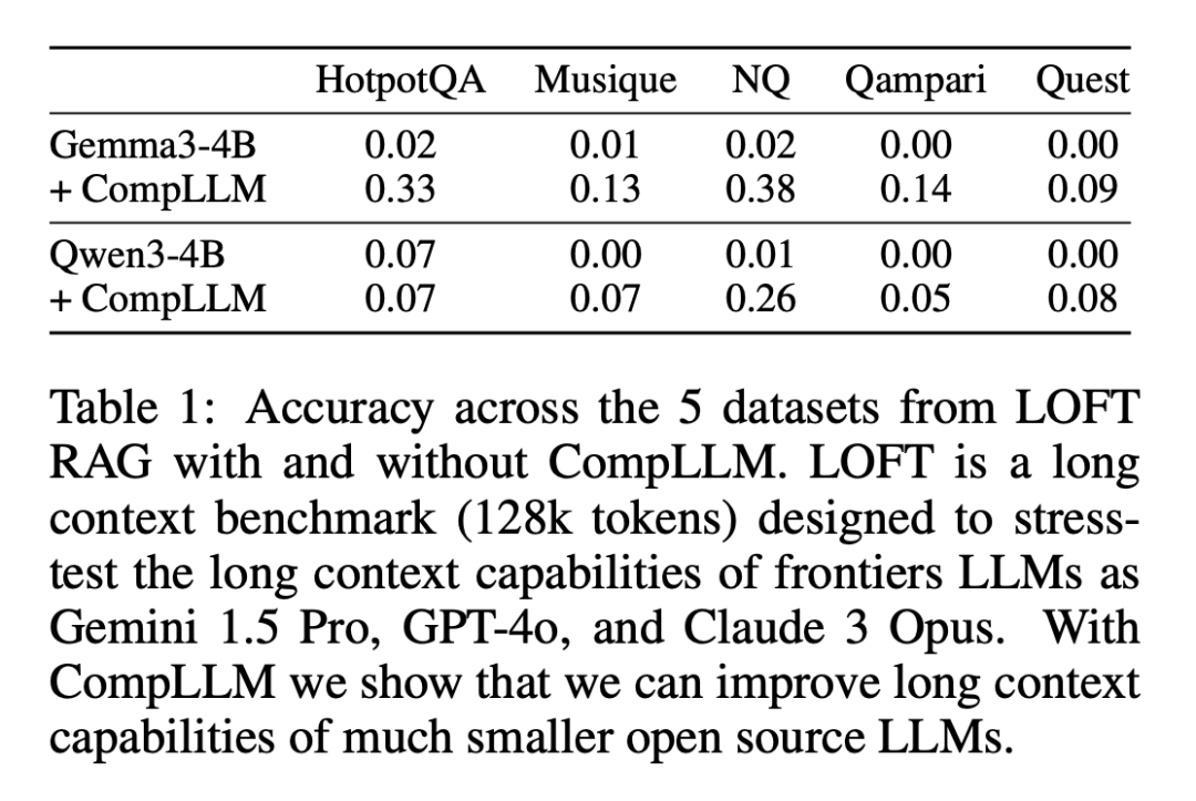▲ 表1. 在 128k 超长上下文下,CompLLM 让小模型依然保持稳定优势。