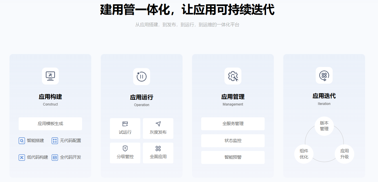 - 一体化运维管理:提供应用发布、监控、版本管理的全生命周期管理能力,支持灰度发布和实时运维。