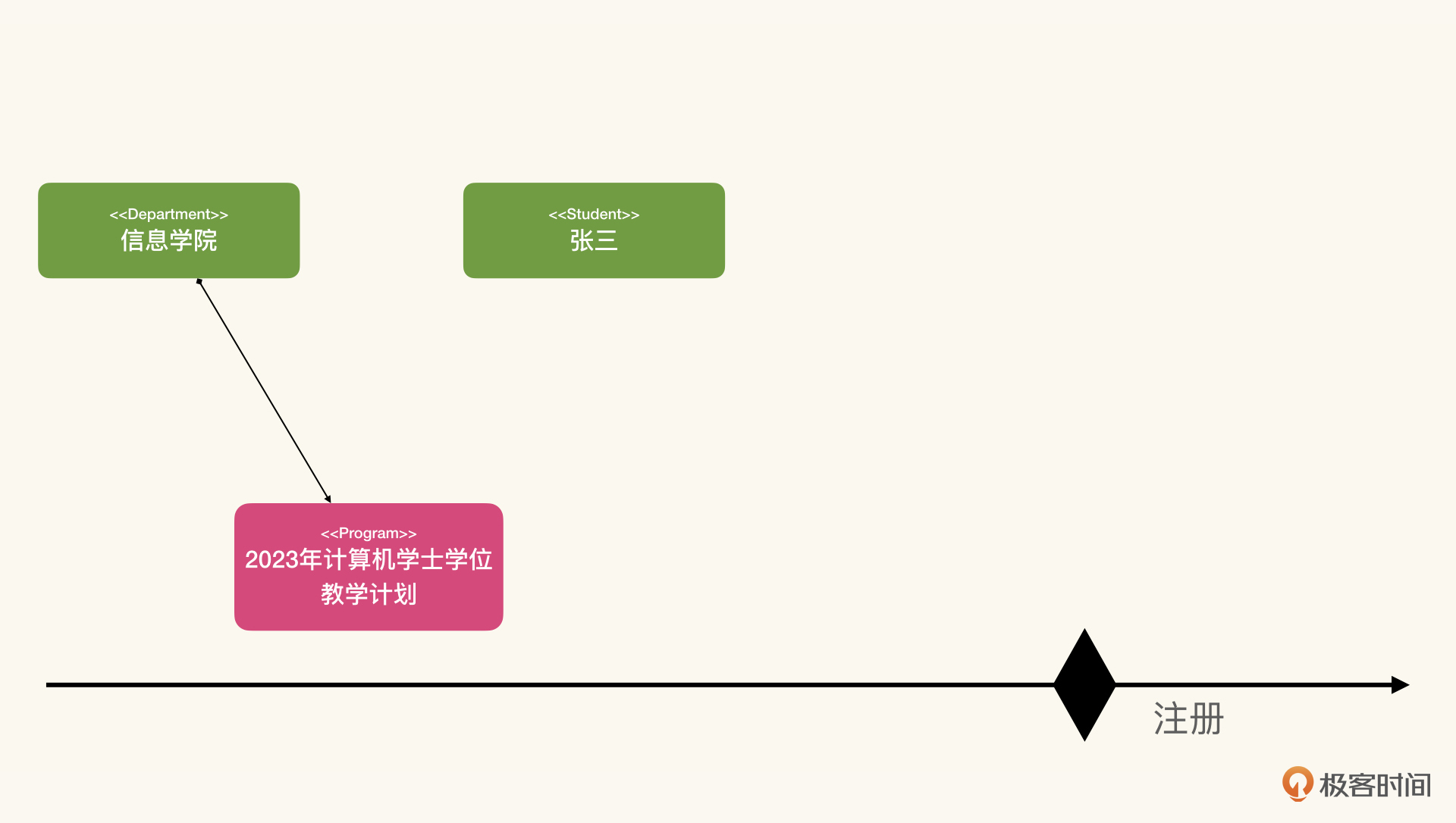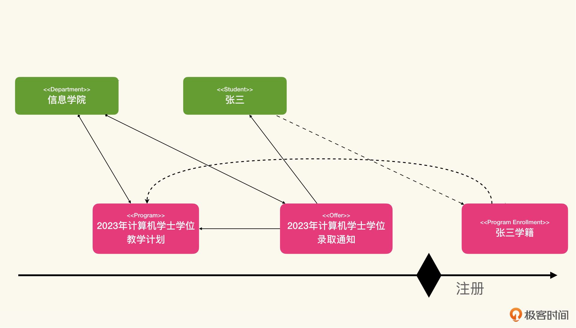 时间轴上有一个关键节点,就是我们当前的业务场景注册。在注册之后,我们产生了新的实体学籍,同时产生了新的关联关系,也就是图中用虚线表示的张三-张三的学籍,还有教学计划-张三的学籍。