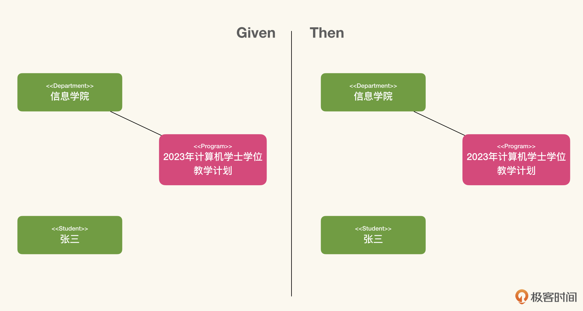 如上图所示,我们将模型在这个验收条件的上下文中做了实例化。对应验收条件中,Given的描述是“获取了录取通知的学生没有注册学籍时”,这表示存在一个Offer对象实例,而没有Program Enrollment的实例;而Then的描述“这个学生将能成功注册学籍”,则表示我们可以生成Program Enrollment的实例,并将这个实例与Offer中的教学计划关联。