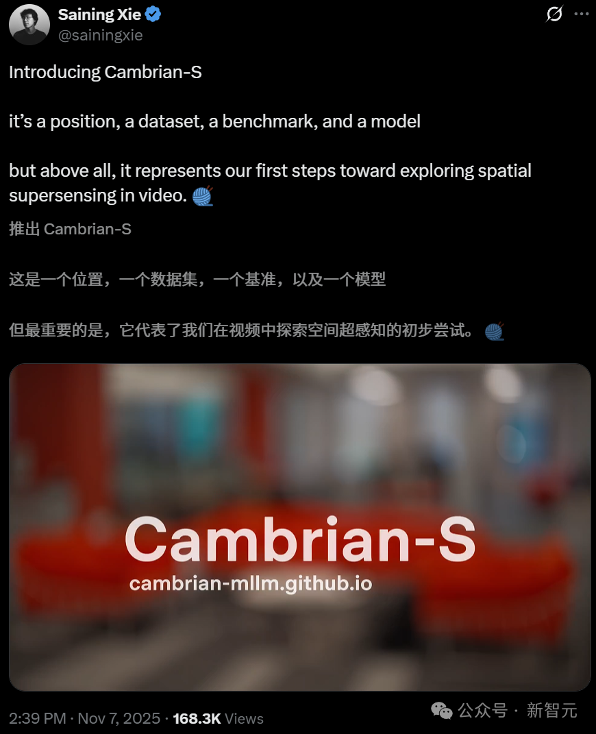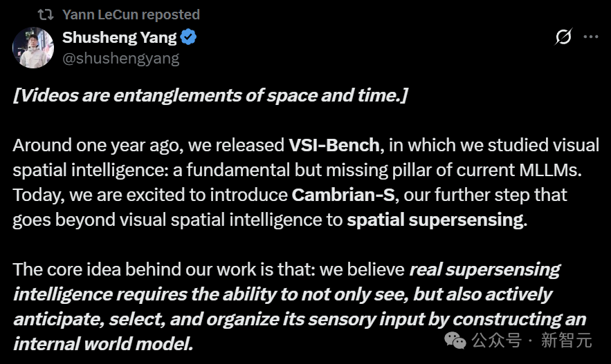 最近,Yann LeCun、李飞飞和谢赛宁联手发了一篇论文——「Cambrian-S:迈向视频中的空间超感知」。