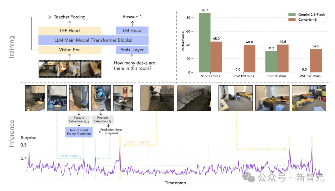 为验证这一想法,团队在Cambrian-S模型之上,训练了一个潜在帧预测 (Latent Frame Prediction, LFP) 模块。(过去人类模仿鸟类、蝙蝠发明了飞机和超声波,这次AI要模仿人类了)