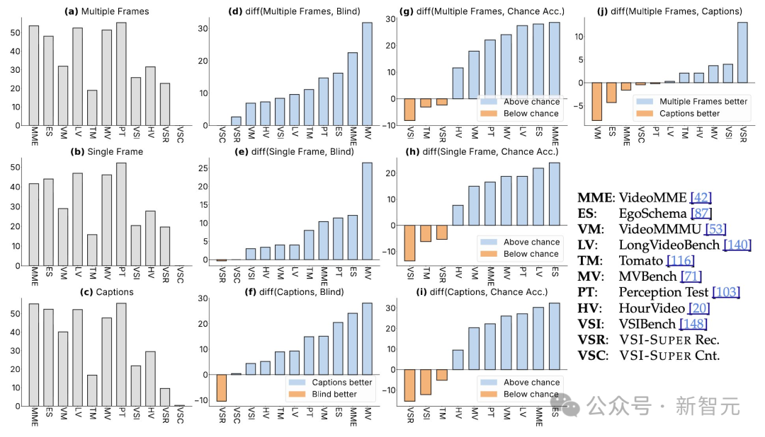 许多视频基准测试甚至不需要真正的感知能力;正如团队所展示的,仅仅依靠单帧图像或字幕就能获得高分。