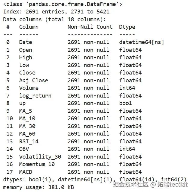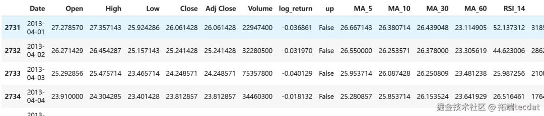 下图能看到,MA_5、RSI_14、OBV等指标都成功加进去了,特征维度一下丰富了!