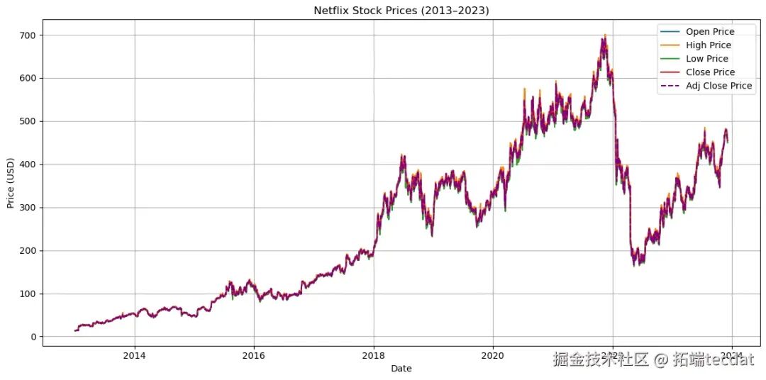 从图里能看明白:2013-2021年Netflix股价一路涨,2021年到峰值后开始落;而且调整后收盘价(紫色虚线)和收盘价几乎重合——说明这10年没拆股等大动作,数据稳定性超棒,不用额外处理!