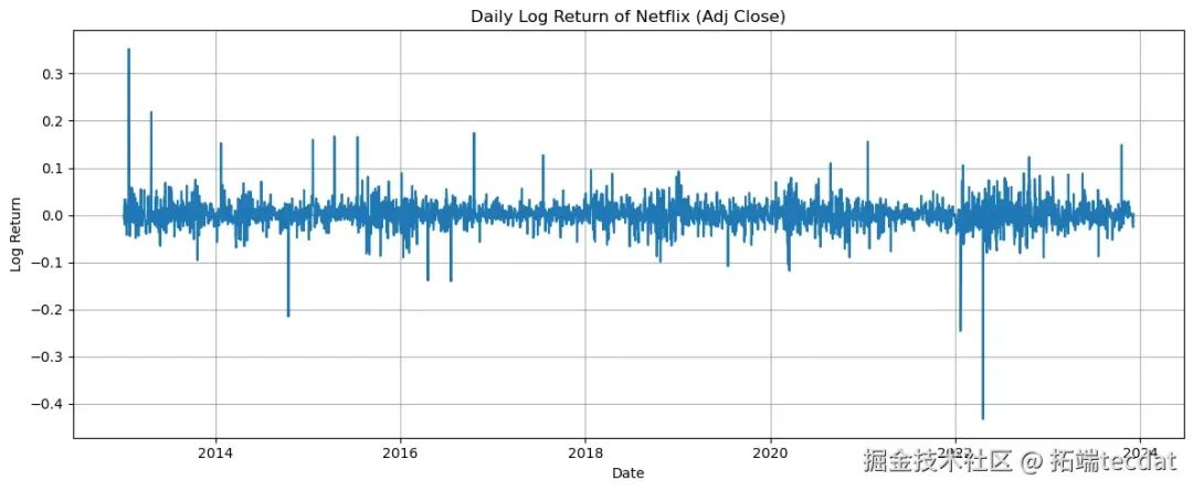 图里很明显:大部分时间波动围绕0值转,但2020年疫情初期、2022年公司业绩波动时,出现大的异常值——这说明这些时段股价波动骤增,后续模型得考虑“极端场景”,不然容易预测不准!