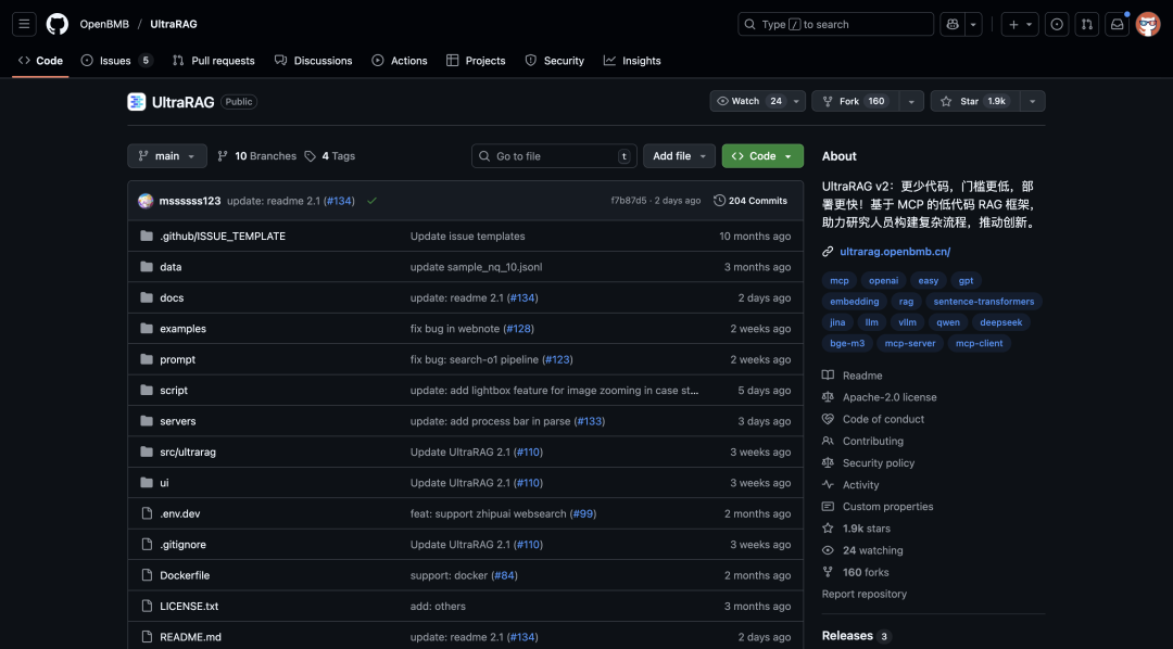 UltraRAG 是由清华 THUNLP、东北大学 NEUIR、OpenBMB 等多方联合推出的开源项目。