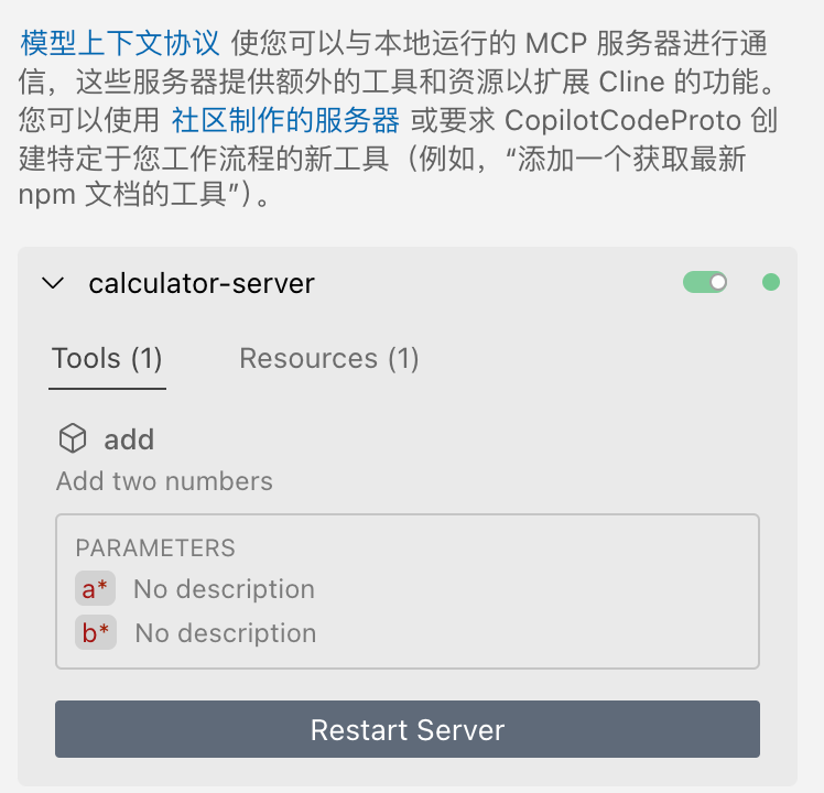 注:MCP Golang[4] 目前是个人维护版本,已经有两个月不更新了,暂不支持 resource template,与 CLine 存在兼容性问题。